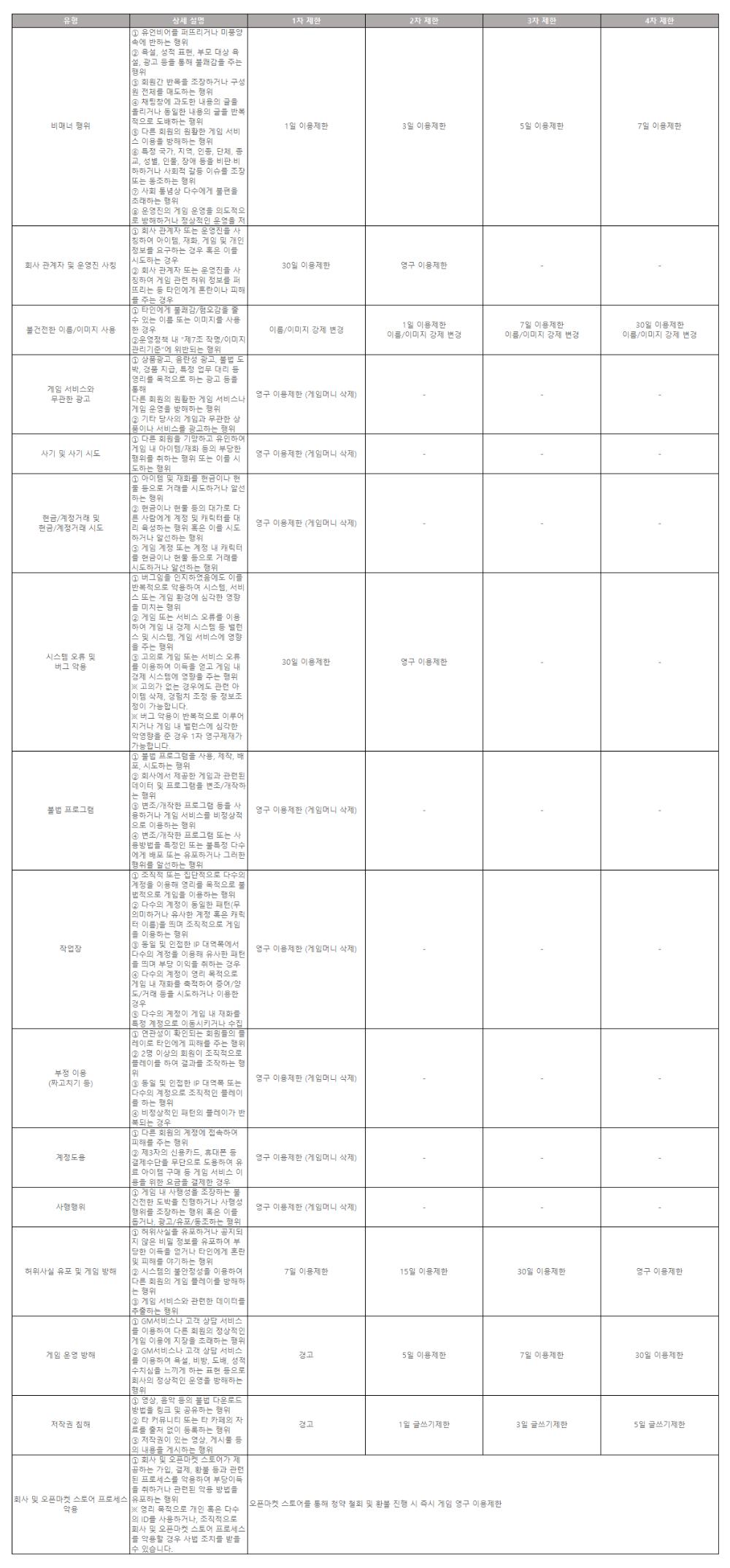 ① 게임 영구 이용제한 : 게임 계정 및 관련 서비스의 이용을 영구적으로 제한합니다.