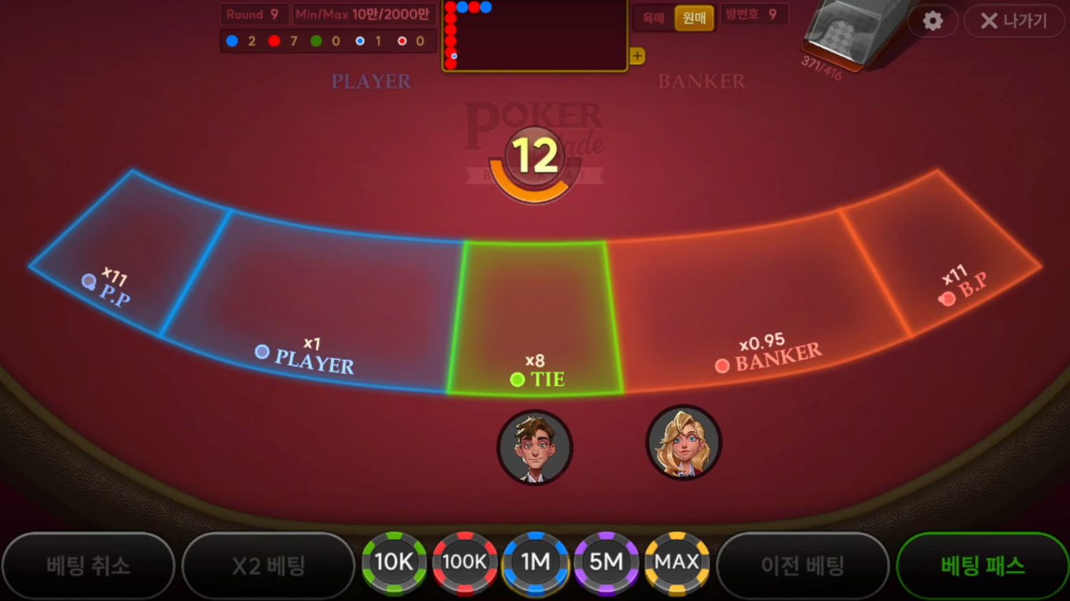뱅커 페어(B.PAIR)의 승리가 예상되는 곳에 베팅할 수 있습니다.