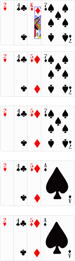 이 외 4장의 카드가 무늬 또는 숫자가 같을 경우 가장 높은 숫자들을 제거한 가장 낮은 숫자인 1장의 카드를 탑이라고 합니다.