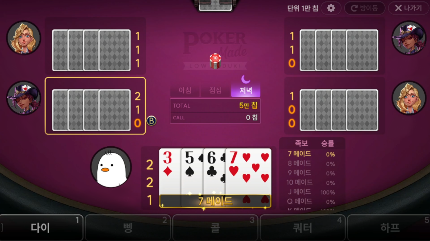 자신의 족보 승률을 우측에서 확인할 수 있으며, 게임 시작 시 자신에게 배분된 카드 패와